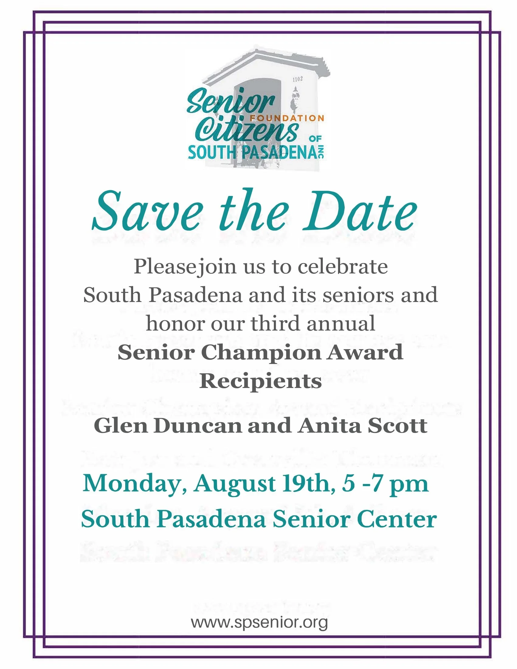 Join us Monday, August 19th, 2024 as we honor this year’s Senior Citizens’ Foundation of South Pasadena Senior Champion award recipients! Glen Duncan and Anita Scott have contributed so much to our community through the years. We are so excited to celebrate these two amazing people!